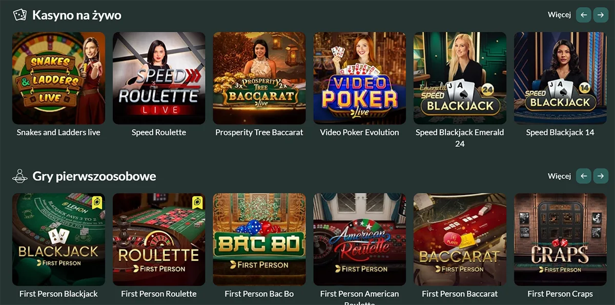 Nasze kasyno na żywo przenosi atmosferę prawdziwego kasyna bezpośrednio do Ciebie. Współpracujemy z Evolution Gaming i Ezugi, liderami branży live casino. W ofercie live gaming znajdziesz: